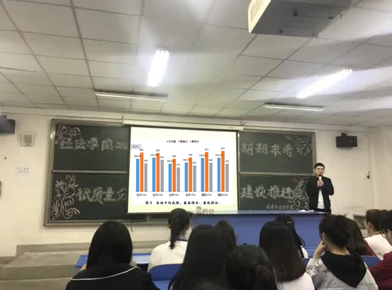 经法学院辅导员侯鑫利用统计数据和量化分析方法,图文结合,直观化、精准化的展示出2017级学生第一学期的整体学习情况、内部差异以及存在的问题。并且以此为依据,帮助学生们制订和修改下一个阶段学习目标和学习计划。随后,他根据同学们的实际学习情况提出,将从严格管理、制度约束、示范引领、重点帮扶、学风促进、家校合作等几个方向改进,努力达到“促学风建设、助学业提升”的目的。