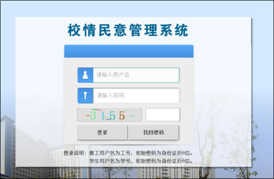 打开学校网站首页,选择右侧校情民意登录按钮登录,或者输入网址:http://218.195.96.62/adviceclient/登录平台。