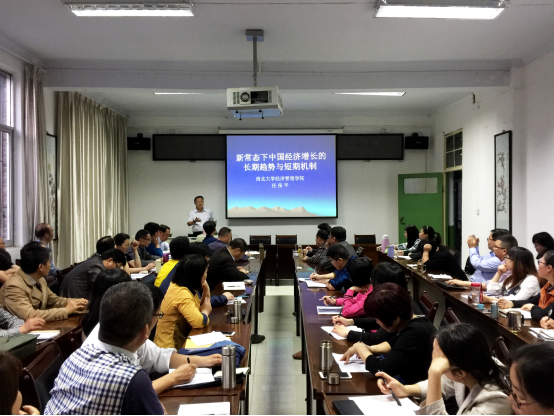 任教授以“新常态下中国经济增长的长期趋势与短期机制”为主题,为经法学院全体教师和研究生作了精彩的学术报告。报告会由经法学院院长关嵩山主持。会上,任保平教授为全体师生解读了中国经济增长过程中的典型事例及经济学中的长期短期划分,加深了对“新常态”概念的理解,他围绕中国转型经济的增长与发展问题分别对中国经济增长的长期趋势与短期表现和新常态下中国经济增长的路径两个方面进行阐述。